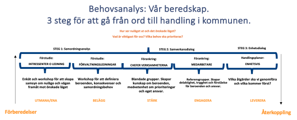 Vi erbjuder en enkel och väl beprövad process där din verksamhet kan ta ytterligare steg framåt. Genom anpassade, förankrade, verksamhetsnära åtgärder kan du med god helhetssyn, gott samarbete, och gott mod bli med säker på att verksamheten är robust, pålitlig och för att skydda medarbetare och medborgare och säkerställa er prioriterade verksamhet. Bild till vänster visar exempel på en process för en kommun, processen är dock oberoende kund.